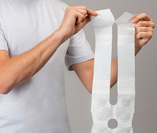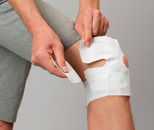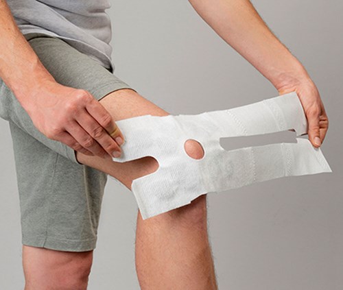 - Aplicați compresa peste zona dureroasă cu partea mai închisă la culoare pe piele și fixați-o, asigurați-vă că deschiderea circulară este peste rotula genunchiului.