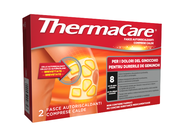 ThermaCare® compresa caldă pentru genunchi a fost conceput pentru a se potrivi genunchiului și poate fi poziționat exact pe zona localizată a durerii, pentru o aplicare flexibilă care permite mișcarea. După aproximativ 30 de minute, produsul atinge temperatura terapeutică de aproximativ 40 °C, care se menține constantă pe întreaga perioadă de tratament rămasă; crește circulația sângelui în țesuturi, producând un efect de ameliorare a durerii și relaxând mușchii încordați.