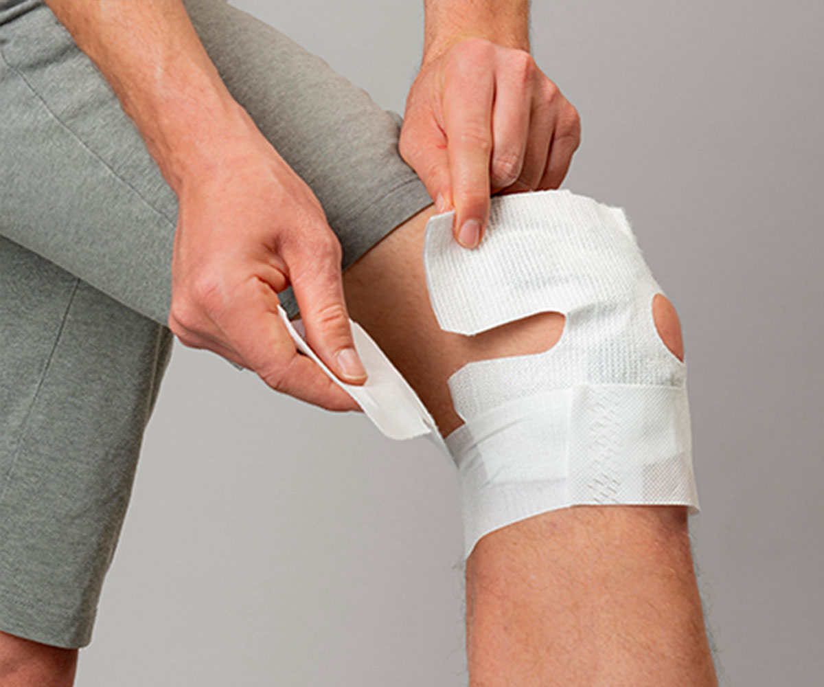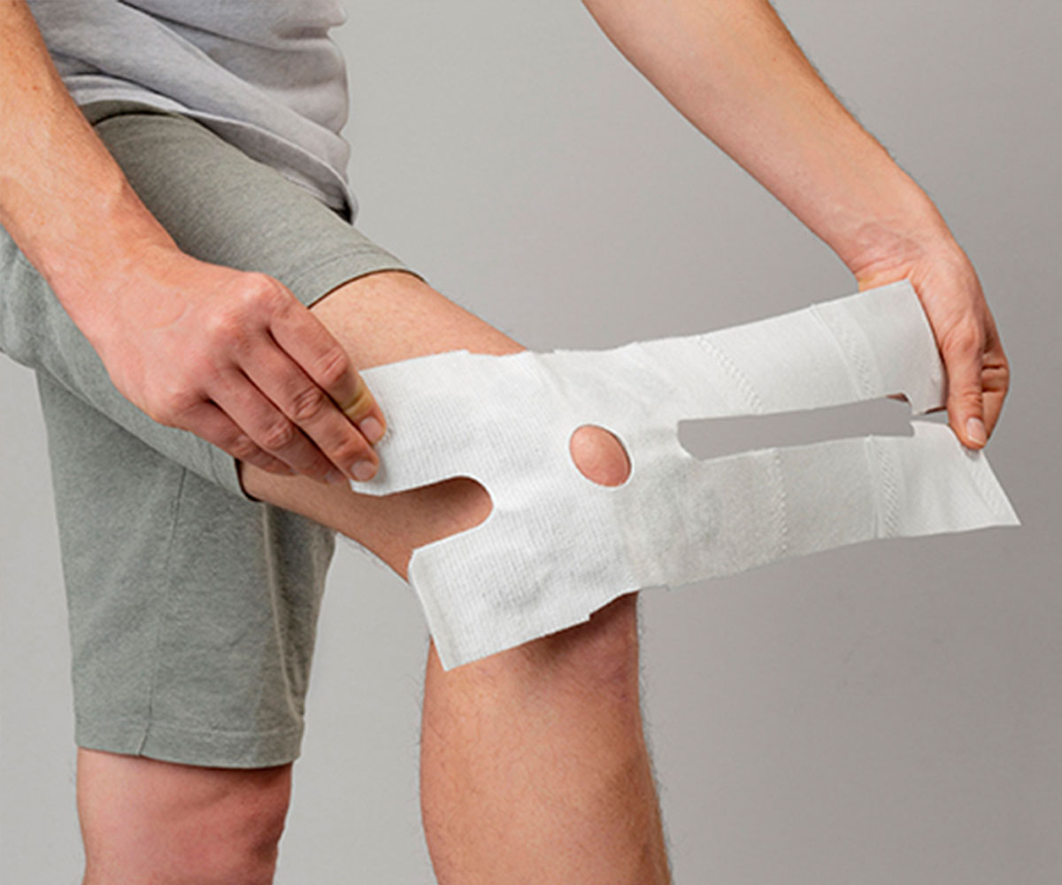- Aplicați compresa peste zona dureroasă cu partea mai închisă la culoare pe piele și fixați-o, asigurați-vă că deschiderea circulară este peste rotula genunchiului.