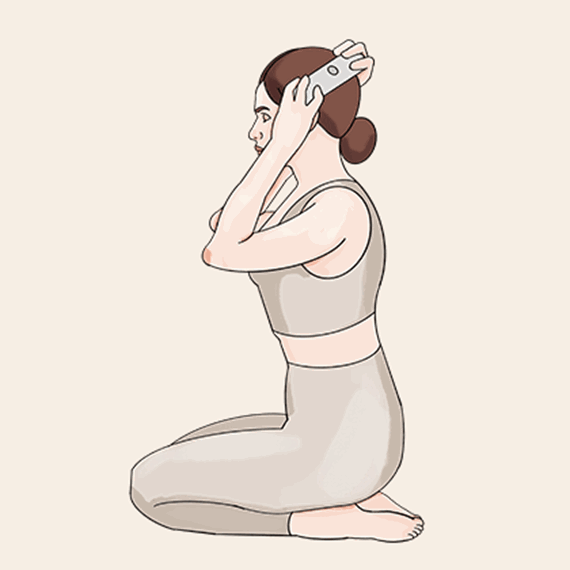 Pasul 1: Stai pe călcâie sau pe un scaun. Îndoaie brațul drept. Cu mâna stângă, apucă partea posterioară de sus a capului (deasupra urechii drepte) și trage încet capul cât mai mult posibil, la un unghi de 45 de grade spre stânga, în direcția cotului stâng. Ține-ți spatele drept și trage-ți pe cât posibil umărul drept în jos spre șoldul drept.