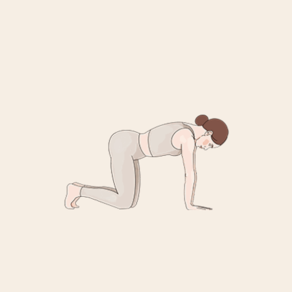 Pasul 1: Se revine la poziția de început, stând pe cele patru membre, cu genunchii depărtați la nivelul șoldurilor. Coapsele sunt în poziție verticală sau puțin mai departe spre călcâi, mâinile sunt depărtate la nivelul umerilor în fața capului, brațele sunt întinse.